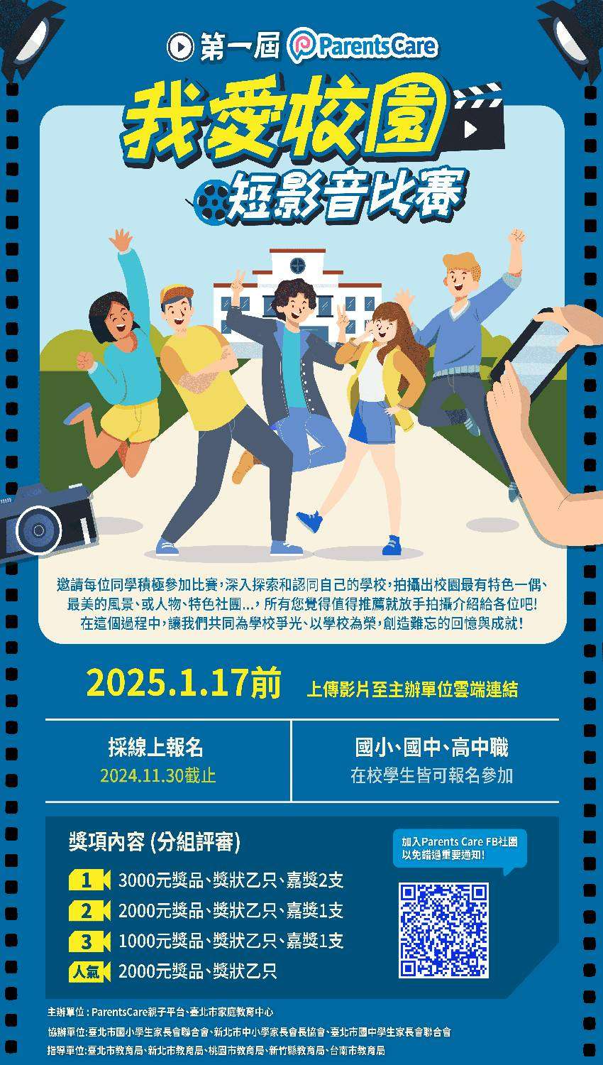 二、比賽報名網址https://www.beclass.com /rid=2748c55634801c34e9dd,活動詳情可至ParentsCare 家長大小事FB粉絲專頁(https://www.facebook.com /groups/434955752481737/)查詢。