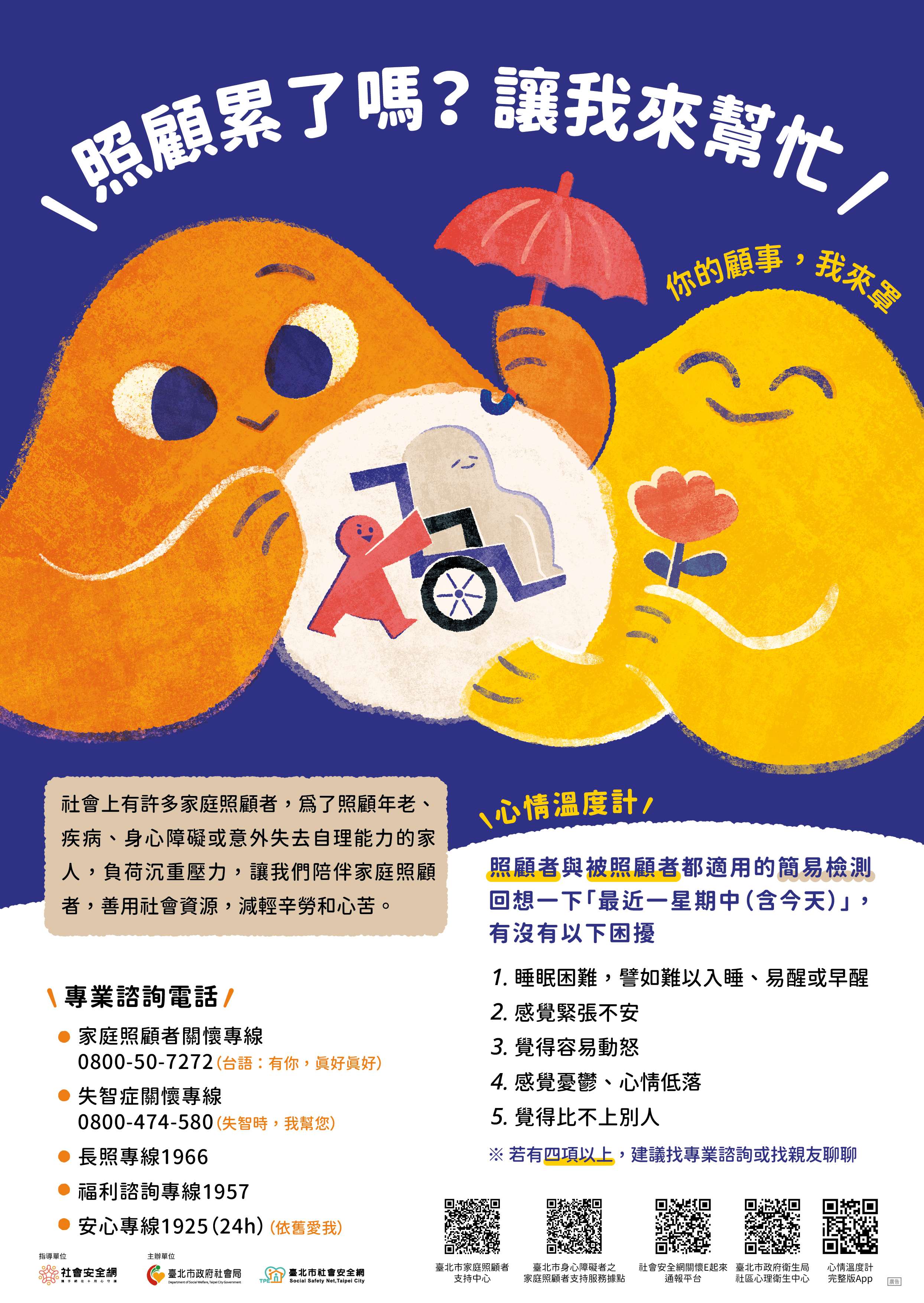二、為關注「家庭照顧者」心理健康及需求,推廣社區友善互 助及長期照顧資源,強化本市超高齡社會支持韌性,爰製 作旨揭宣導海報及摺頁文宣。