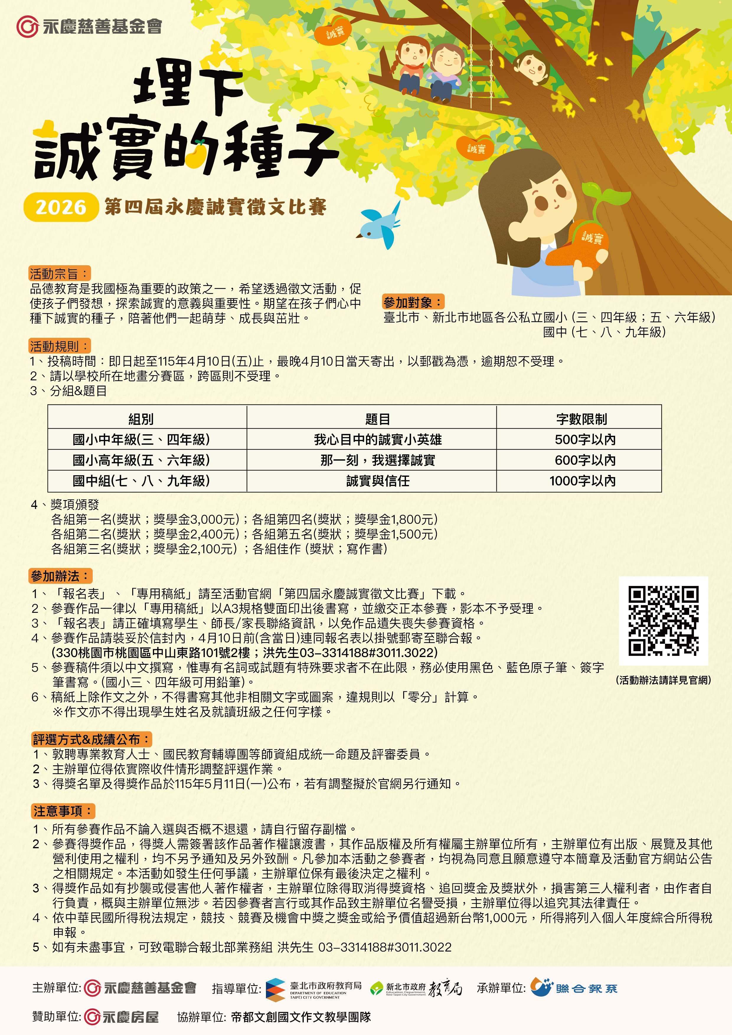 二、旨案乃為透過徵文活動,培養學生對於生活的觀察力,並 從寫作中探索自我價值與思潮,讓品格教育的觀念向下扎 根,以「埋下誠實的種子」為主題,希望學生從將品格素 養融入文字的過程中,亦將優良德行落實於日常生活、徵 文活動內容摘要如下: