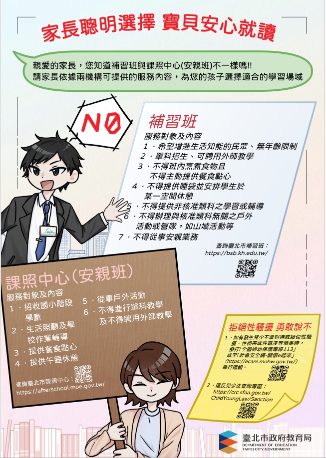 一、有鑑於補習班與兒童課後照顧服務中心兩者服務對象重 疊、性質相近,惟因設置目標、功能及經營方式不同,分 別因循不同設置規定,故常有業者以較寬鬆規範立案補習 班從事課後照顧中心業務致違反現行法令,影響兒少權 益,為健全補教環境並維護家長知的權利,以多元 管道向家長宣導。